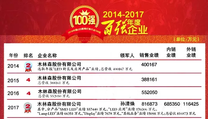 此次百強榜中,木林森是增長最快的企業(yè),比去年增加26億。