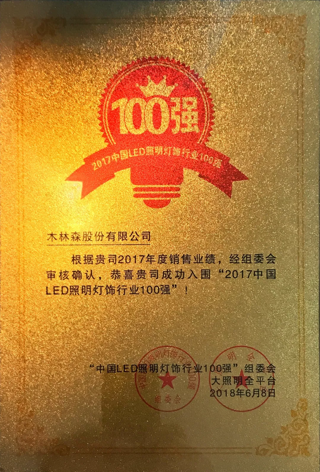 6月8日下午,廣州塔上“2017中國LED照明燈飾行業(yè)100強”(簡稱“百強榜”)榜單正式揭曉,木林森以“2017年銷售業(yè)績81.69億元”位列百強榜第二名。