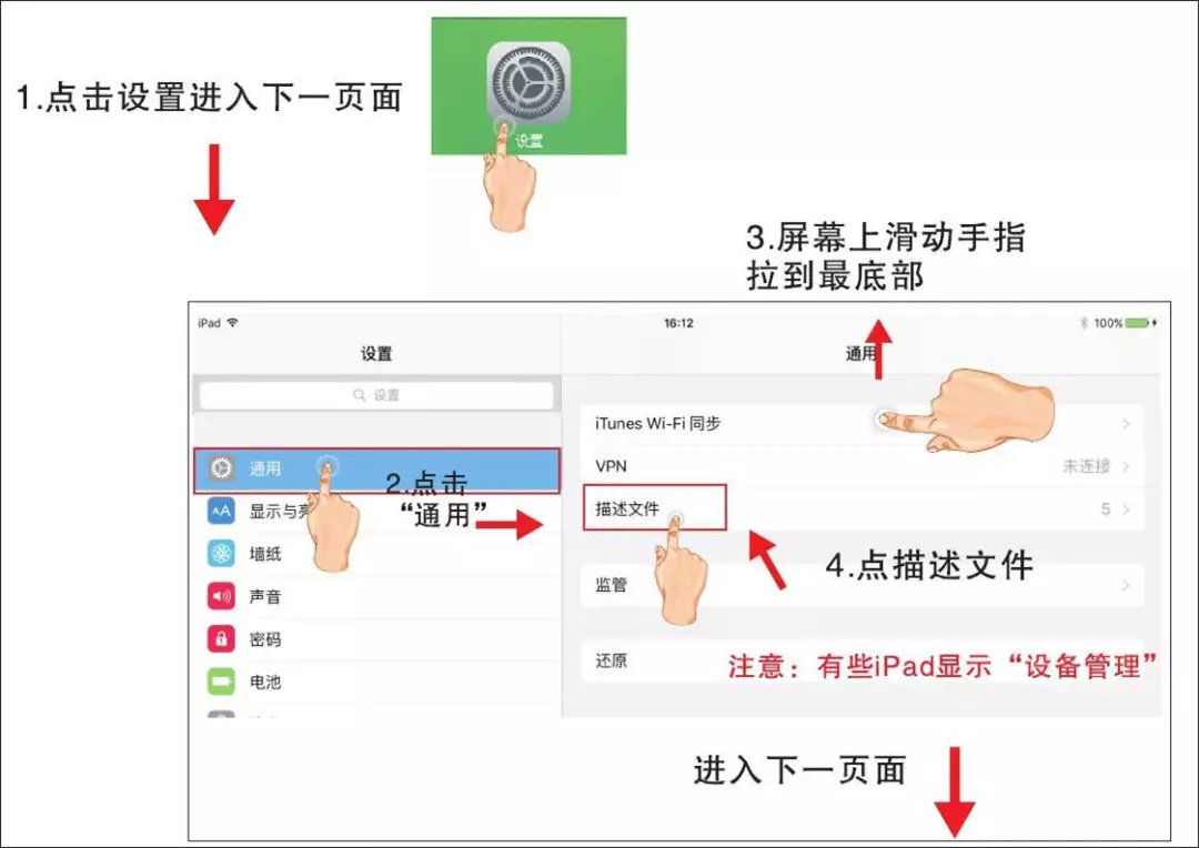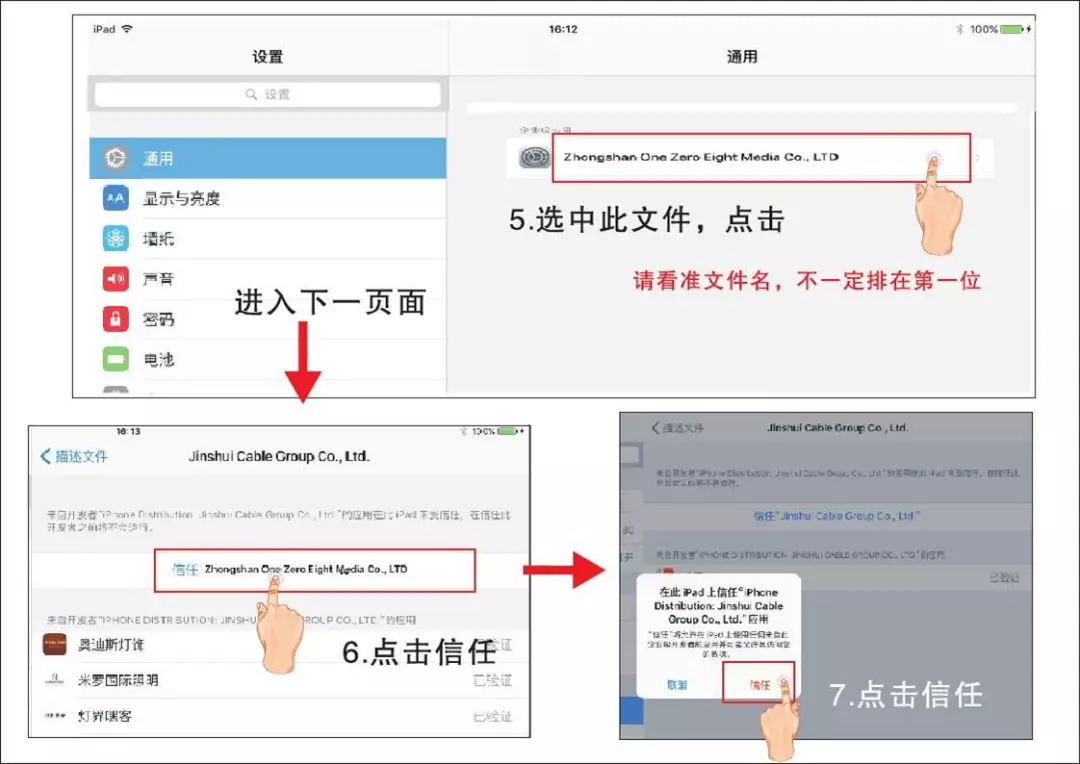 4、APP安裝后打開時(shí)如果提示“未受信任的企業(yè)級(jí)開發(fā)者”,則信任程序即可。操作步驟:設(shè)置→通用→設(shè)備管理(或者叫“描述文件”)→信任 Zhongshan One Zero Eight Medial.,LTD;