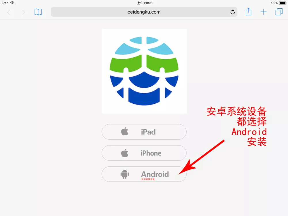 3、輸入安裝網(wǎng)址:http://peidengku.com/app/id/754,選擇相應(yīng)版本點(diǎn)擊并確認(rèn)安裝,然后返回桌面等待APP安裝完成。安卓平板電腦、安卓手機(jī)和終端機(jī)均選擇Android安裝;